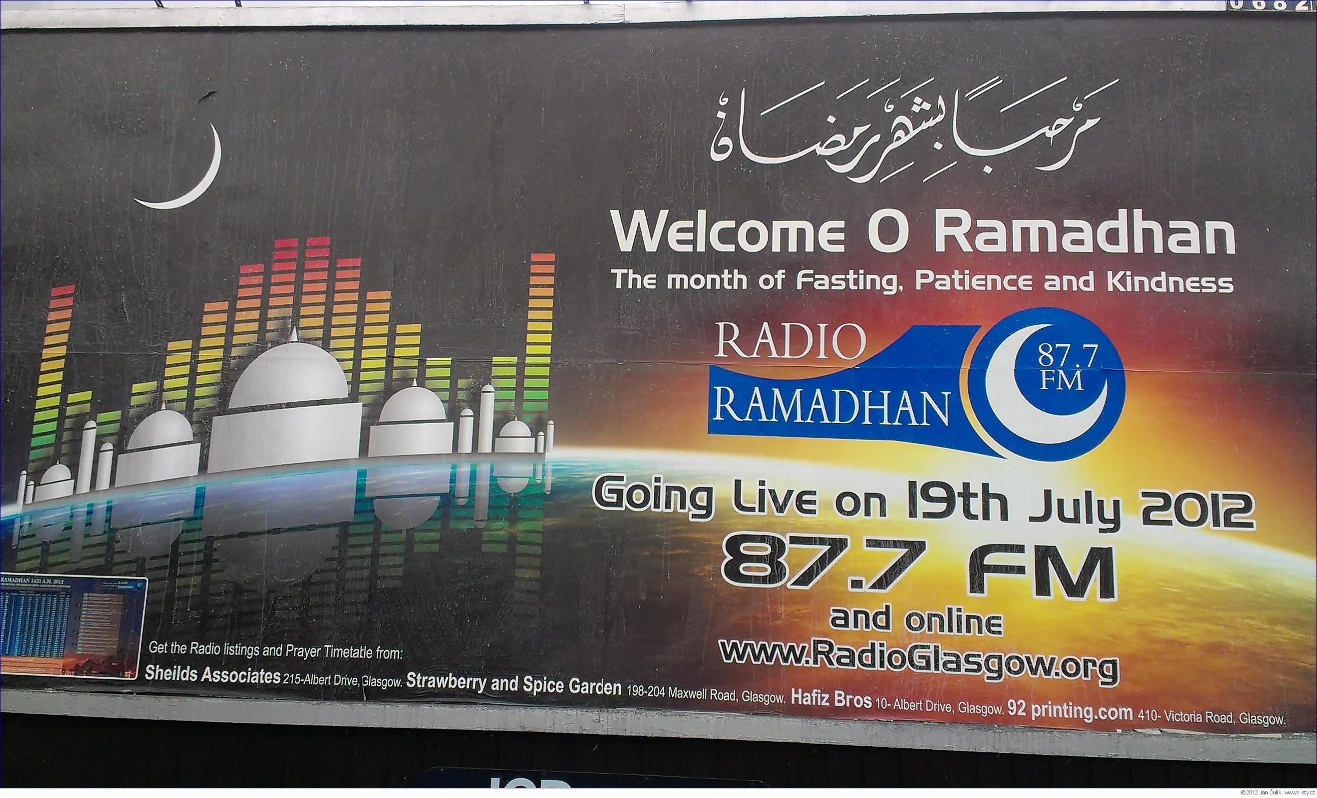 < Billboard k ramadánu ve skotském Glasgow. Místní "Rádio Ramadán" vítá tento měsíc jako měsíc "půstu, trpělovosti a laskavosti".