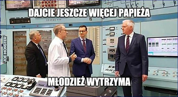 Ministerstvo školství mezitím zanalyzovalo školní osnovy a zjistilo, že i v příručkách zavedených v roce 2017 stranou PiS je příliš mnoho „politické korektnosti“ a „levicově liberálních pojmů“ a málo textu o církevních a křesťanských hodnotách. Vládnoucí papaláší jsou zcela zjevně v této věci mimo, protože Poláci už mají církve zjevně dost - dokonce i biskupové veřejně připouštějí, že rekordní počet odchodů lidí z církve je znepokojující (pro ně!). Mem, jasně inspirovaný scénou z dramatu HBO „Černobyl“, kde vidíme zaměstnance velínu těsně před výbuchem, ukazuje prominentní politiky PiS ve velínu elektrárny, jak říkají „Dej tam ještě papeže, mládež to vydrží!“.