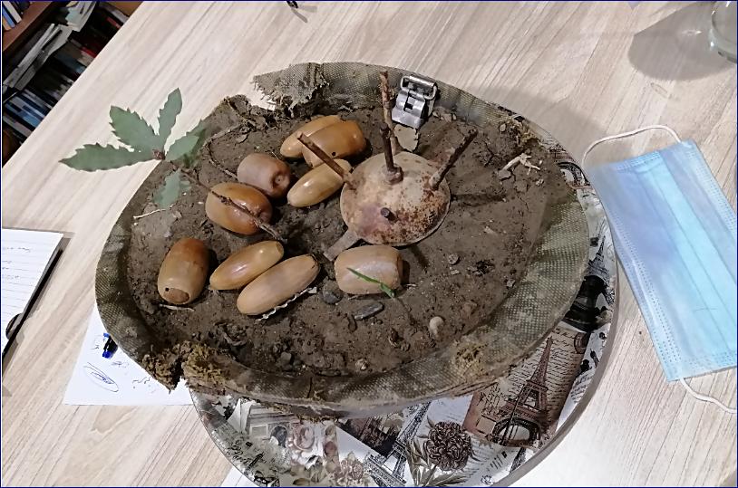 Foto: Umělecký předmět z kulturního centra v Chomanu vytvořený z helmy, části deaktivované nášlapné miny (okolí Chomanu je stále zamořeno minami z dob Irácko-Íránské války, každá vesnice má alespoň jednu oběť min) a přírodnin. Rouška značí nastupující Covid-19 pandemii.