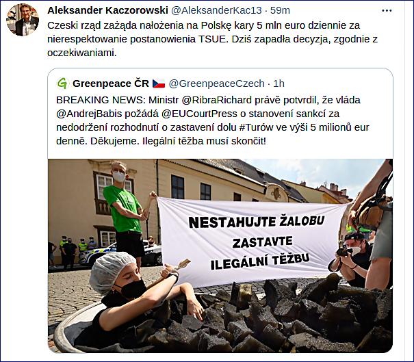 “Jsme rádi, že Česká republika navrhne sankce za nedodržení rozhodnutí evropského soudu, který nařídil zastavit těžbu na dole Turów. Jsme ale zklamáni, že vláda stále uvažuje o smlouvě bez jakéhokoli omezení těžby. Protože pokud stažení žaloby na důl otevře cestu k další těžbě až do roku 2044, tak to bude z pohledu místních lidí i z hlediska ochrany klimatu velmi špatná dohoda a selhání vlády.”