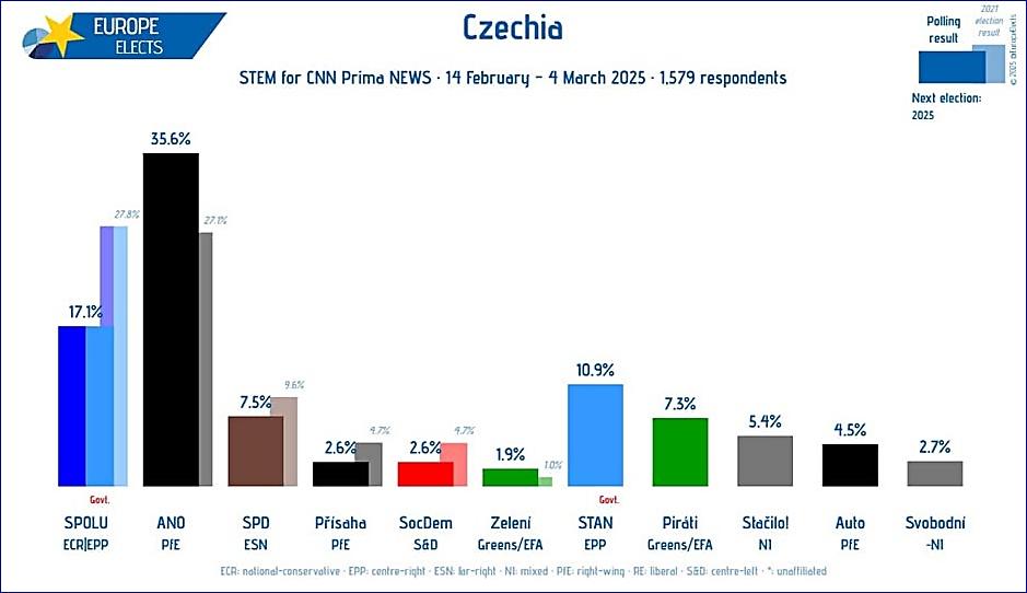 Koukat se na ty preference prizmatem toho, jak je prezentuje Europe Elects, tedy se sloupečky podle barvy, k jaké evropské frakci ty strany