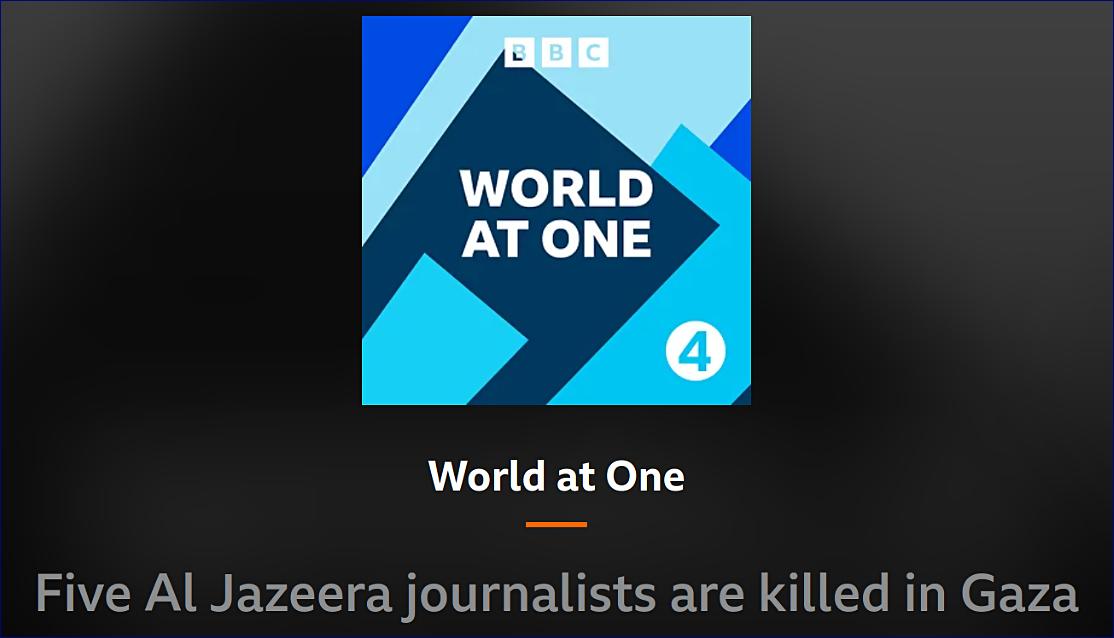 Moderátor, pořad The World at One, BBC Radio Four, pondělí 11. srpna 2025, 13 hodin: Dobrý den a vítejte v pořadu The World at One. Al Jazeera odsuzuje zabití pěti svých novinářů v Gaze.