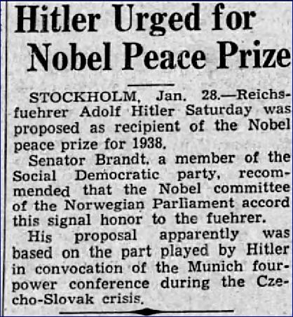 Foto: Im Januar 1939 wird Adolf Hitler stellvertretend für die Münchner für den Friedensnobelpreisnominiert :). Wird dies nun auch ein Präzedenzfall für Trump sein?