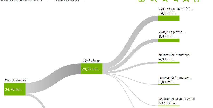 Ještě že tu máme stát (heh), který tyto jistě-jen-nezáměrná-opominutí napravuje a zveřejňuje tzv. rozklikávací rozpočet, ze kterého můžeme už zjistit rozpad výdajů. Ten je opět krásný a typický pro samosprávné obce České republiky: