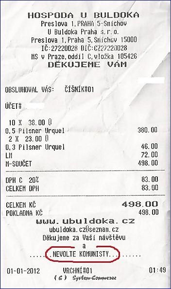 Posílám účtenku z pražské restaurace U Buldoka, kde jsme se s přáteli zastavili na oslavu Silvestra. Přáli jsme ze zvyku hodně sil v novém "rozpočtově odpovědném" roce -- a opravdu, lepší důkaz dnešní atmosféry ve společnosti jsme si snad nemohli ani přát -- přišel hned po zaplacení. Na účtence čekal vzkaz zákazníkům: "Děkujeme za návštěvu a NEVOLTE KOMUNISTY." Martha Issová a Jirka Mádl zřejmě přemluvili už i majitele této restaurace, aby páchal jen dobro, píše Petr Duffek.
