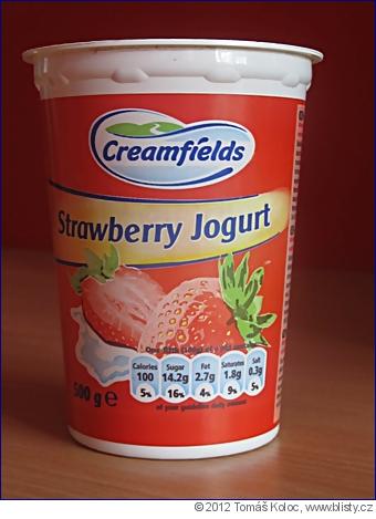 Nyní se tedy vyznamenala firma Creamfields, která uvedla na trh výrobek s anglicko-českým názvem "Strawberry Jogurt", který by anglicky zněl "Strawberry Yogurt" (lze i "Yoghurt" nebo "Yoghourt") a česky "jahodový jogurt"...