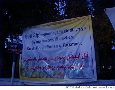 „Zde žijí Kurdové, Arabové, Arméni a Turkmeni“, vítá nás nápis u vjezdu do Gire Sipi. Ve městě pak stejný plakát vídáme na několika místech. Kvůli specifické skladbě obyvatelstva má Gire Sipi vlastní, vysoce autonomní samosprávu. Potkali jsme Kurdy, kteří Gire s jeho okolím označují za čtvrtý kanton, oficiálně nicméně spadá pod Kobani. Městská rada, která byla před nedávnem ustanovena, má zastoupení z řad příslušníků všech menšin, povoleny jsou čtyři úřední jazyky.